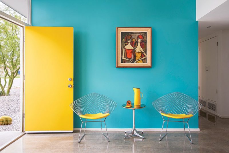 That yellow, orange and green in the vintage fabric, and a complementary blue, are now found throughout the home. The paint on the front door, the furnishings on the guest patio and the Cathrineholm enamelware in the kitchen and living room complement one another. All the aspects flow together beautifully to create a vibrant Mid Century Modern showplace that’s also inviting and livable.