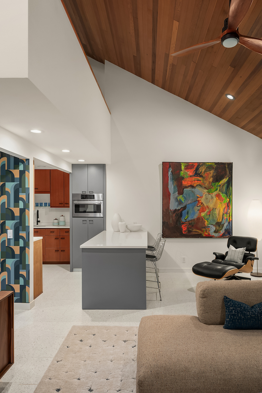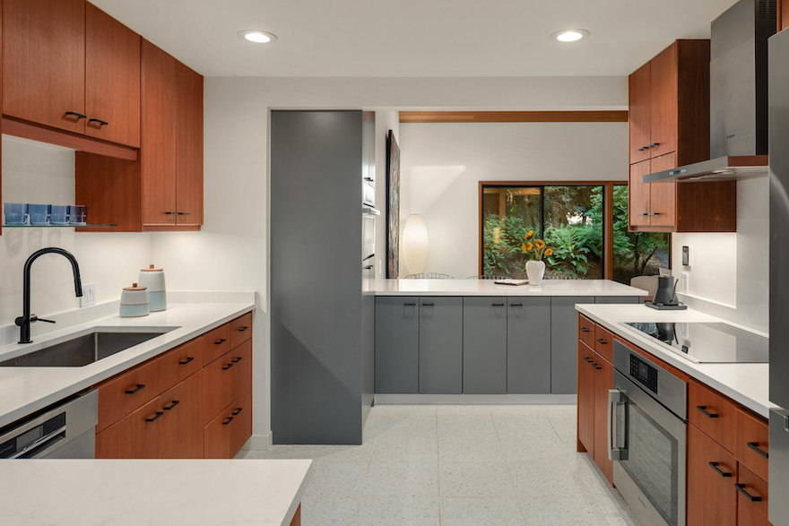 Slate gray cabinetry introduces some variety, and the sleek cooktop takes advantage of contemporary technology without detracting from the MCM ambience.