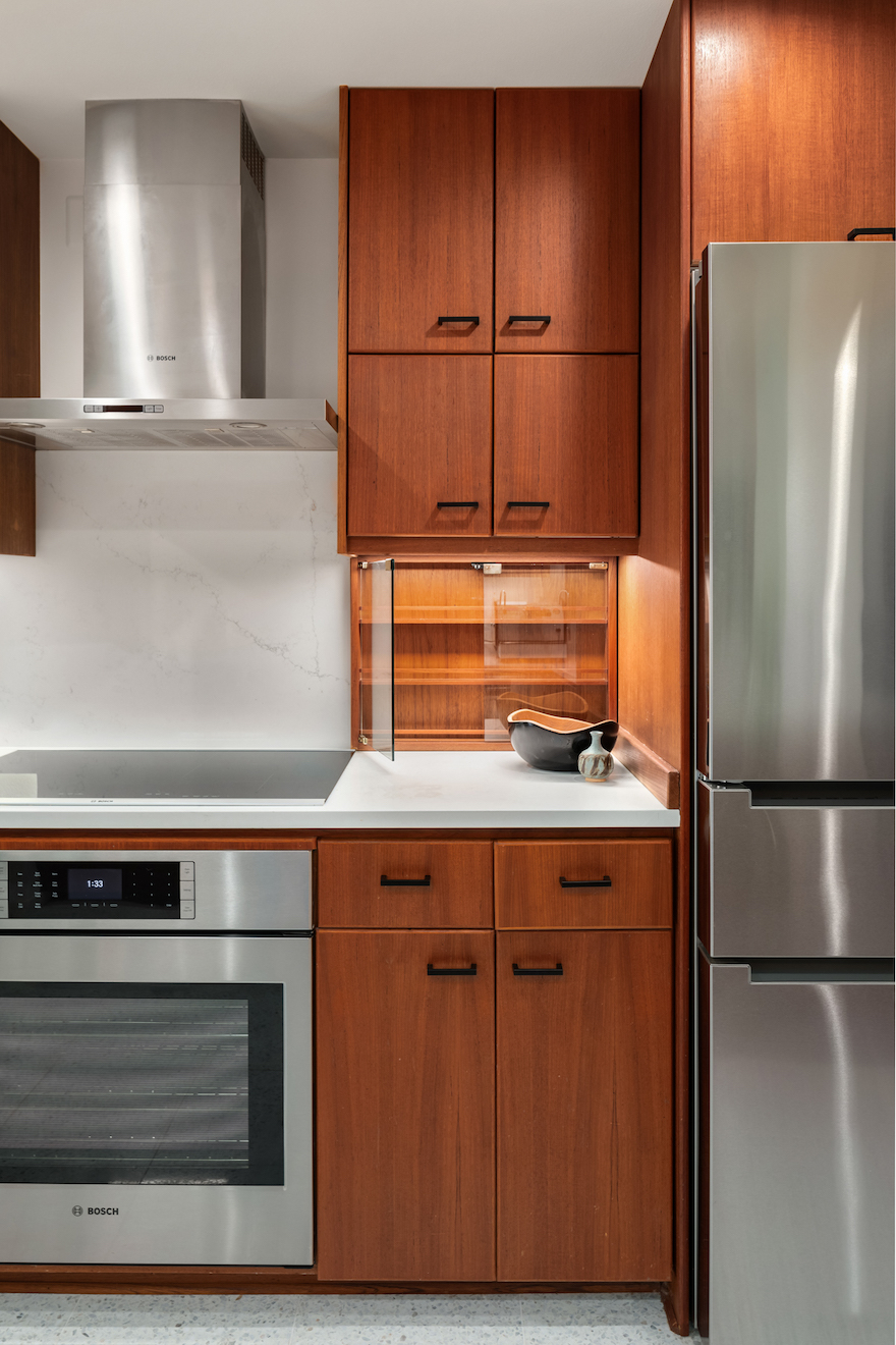 Modernous made sure that the original teak kitchen cabinetry stands out by keeping the kitchen design clean and streamlined.