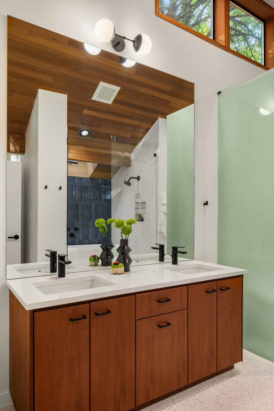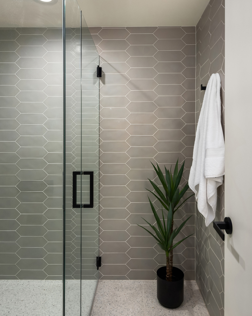 As part of the home’s update, Modernous overhauled the home’s two bathrooms, carrying through the terrazzo floors and a clean, airy aesthetic.