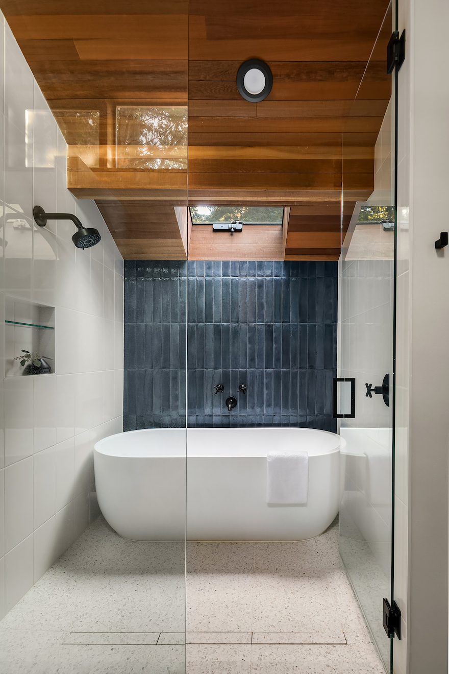 A skylight above the soaking tub and clerestory windows in the facing wall maintains the indoor-outdoor connection (as well as privacy) even in the bathroom.