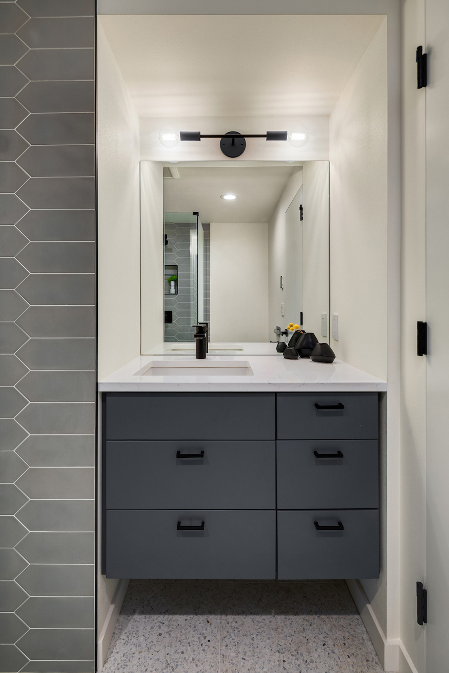 The gray tile in this bathroom echoes the gray in the kitchen cabinets.