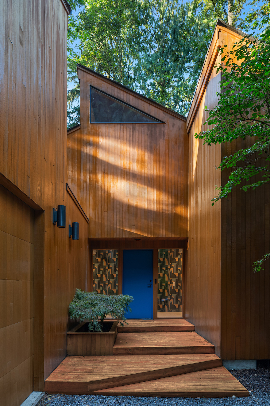 The home is in Woodinville, surrounded by trees in the lush, rain-nourished landscape of the Pacific Northwest. From the outside in, the original teak wood is a stellar feature of the home, and Modernous made sure it had room to shine in the home’s refresh. They also color matched the front door to the Malm fireplace in the living room.